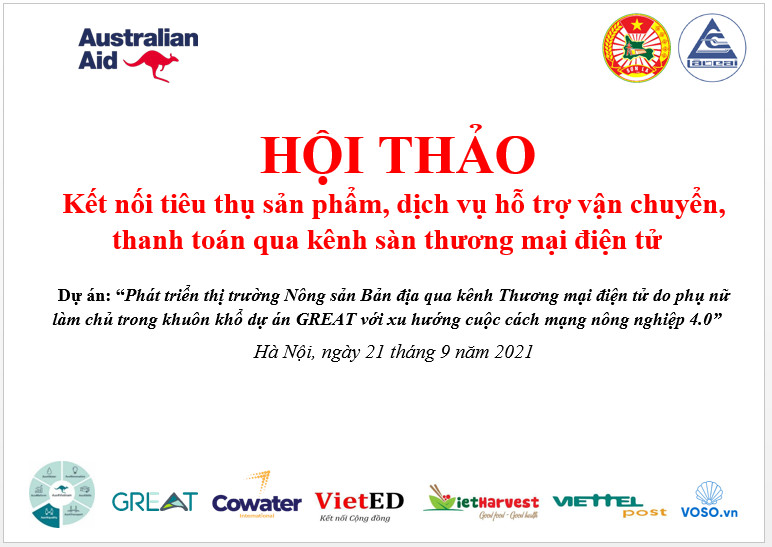 Trong khuôn khổ Dự án: “Phát triển thị trường nông sản bản địa qua kênh thương mại điện tử do phụ nữ làm chủ trong khuôn khổ dự án GREAT với xu hướng cuộc cách mạng nông nghiệp 4.0”, ngày 21/9/2021 Trung tâm VietED tổ chức Hội thảo trực tuyến, với mục đích kết nối tiêu thụ sản phẩm và các dịch vụ hỗ trợ vận chuyển, thanh toán qua kênh sàn thương mại điện tử.