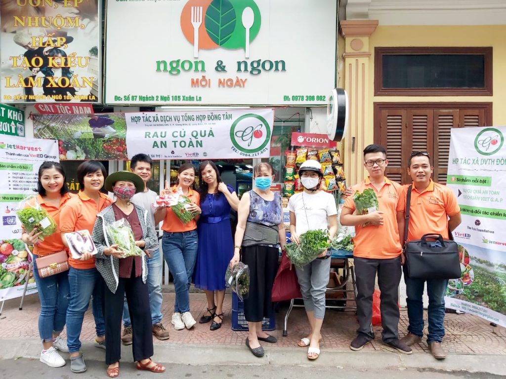 Các sản phẩm rau củ tươi- ngon -an toàn trồng theo tiêu chuẩn VietGap, được nhóm cán bộ bán hàng bày bán trên các gian hàng ngập tràn màu sắc, thu hút các khách hàng ghé thăm. Các khách hàng bày tỏ sự quan tâm cho các sản phẩm về rau, đặc biệt sau khi nhân viên bán hàng giới thiệu về điểm đặc biệt của các mặt hàng nông sản này so với các sản phẩm đang bày bán đại trà tại chợ truyền thống, ví dụ như các thông tin về vùng sản xuất, cách thức canh tác, hình thức sản phẩm,… Mỗi khách hàng ghé thăm thị trường, còn được phát những tờ rơi – chính là những câu chuyện nhà nông thú vị mà Dự án đã tổng hợp được trong quá trình thực hiện cùng bà con.