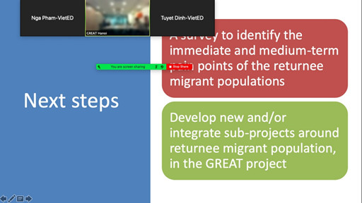Kết thúc buổi thảo luận, hai đơn vị đã thống nhất một số phương án và kế hoạch hành động tiếp theo. Trước mắt, hai đơn vị sẽ tiếp tục đánh giá, thảo luận để thiết lập một Nghiên cứu nhằm đánh giá cụ thể các ảnh hưởng của Covid-19 đến đời sống của người di cư hồi hương tại hai tỉnh Sơn La và Lào Cai.