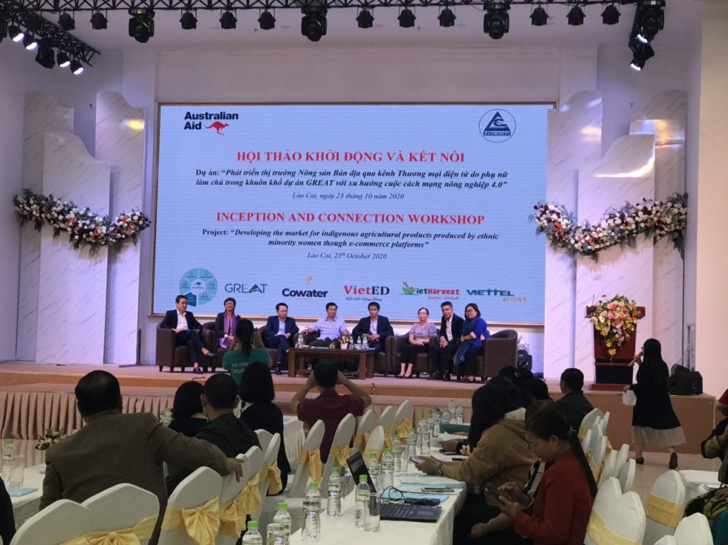 Tỉnh Lào Cao, ngày 23 tháng 10 năm 2020 – Hôm nay, đại diện lãnh đạo các ban ngành, đoàn thể và 20 hợp tác xã của tỉnh Lào Cai đã về thành phố Lào Cai để gặp gỡ, kết nối với đại diện các tổ chức phi chính phủ và doanh nghiệp thương mại và doanh nghiệp công nghệ, các chuyên gia về sàn thương mại điện tử. Tại hội thảo này, các hợp tác xã sẽ được tiếp cận và nắm bắt các cơ hội sử dụng các nền tảng công nghệ của Cuộc cách mạng công nghiệp 4.0 vào kinh doanh và sản xuất, quảng bá hình ảnh các sản phẩm địa phương đến người tiêu dùng ngày càng gần gũi và thân thiện nhất. Điều này đồng thời giúp nâng cao quyền của phụ nữ đồng bào dân tộc thiểu số thông qua phát triển kinh tế.